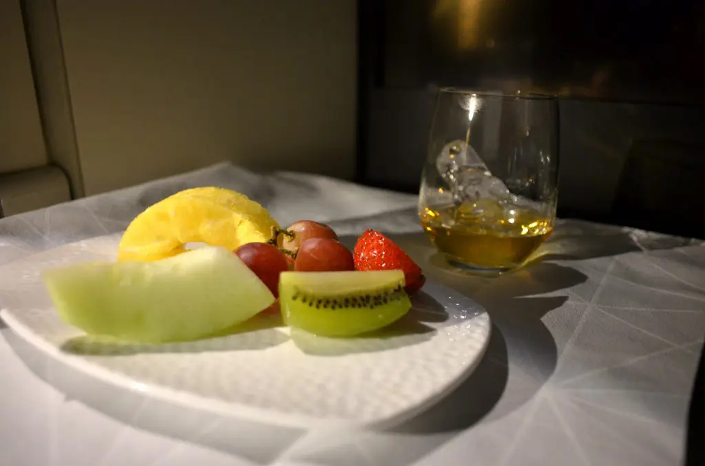 フルーツと食後酒。ウイスキーはシーバスリーガルとグレンリベットですが、食後に少しお酒を飲みながらフルーツを食べれるのは嬉しいです。チーズもありますが、あまり美味しそうじゃなかったのでフルーツがお勧めです。