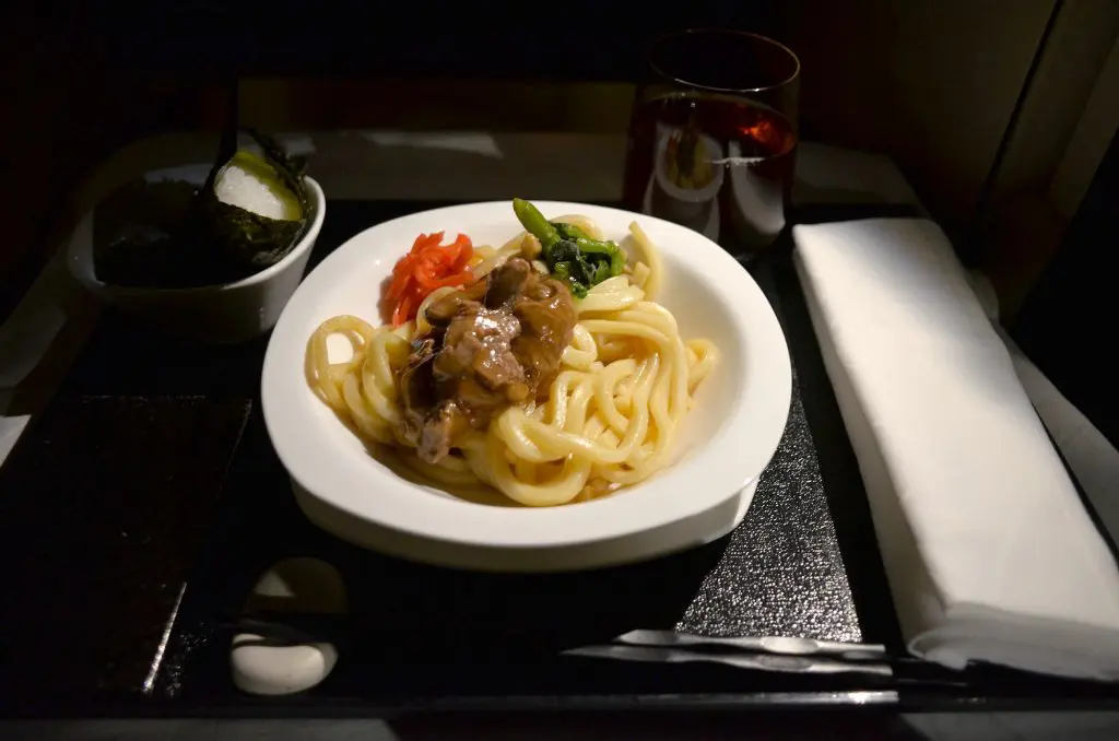 夜食のうどん。日本人が複数搭乗していたので、一人が頼むと同時に立て続けに4人頼んでいましたが、全員こう思ったことでしょう。「これじゃない」と。