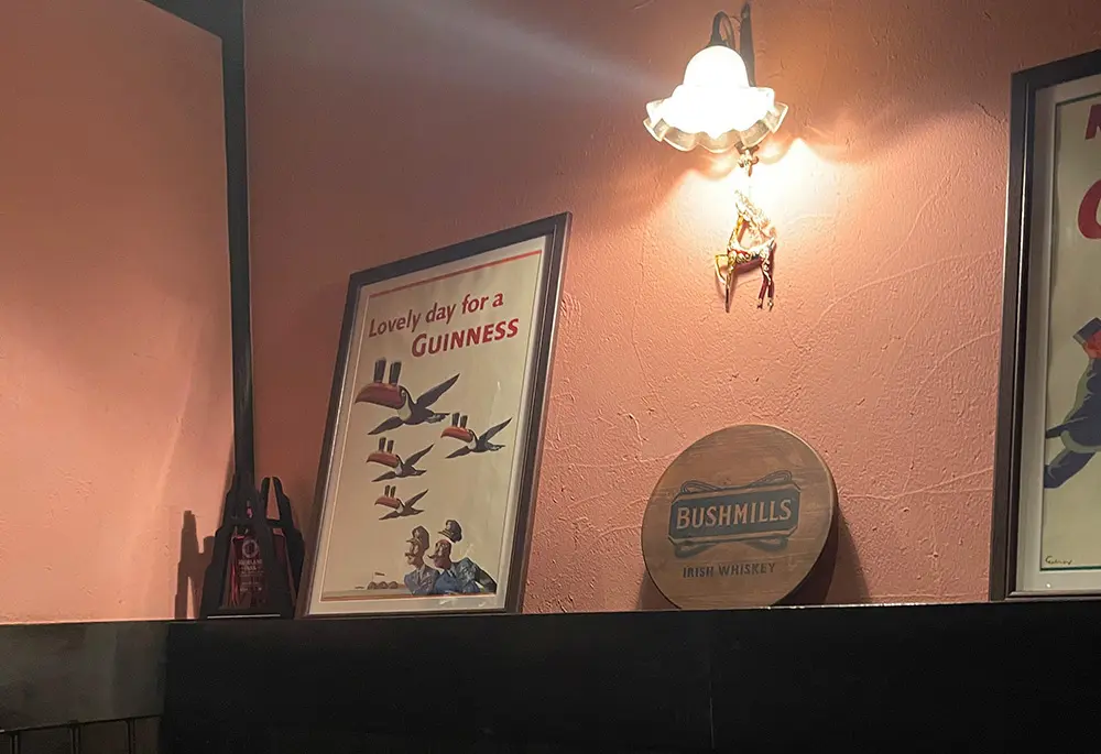 背後のポスターには”Lovely day for a GUINESS” (ギネスの素敵な一日)とオオハシが2つのグラスを乗せてこちらに向かってくる絵が。
