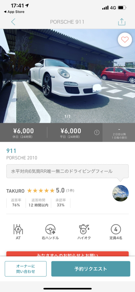 例えば2010年のポルシェ911が24時間で6,000円など非常に安い貸し出しも存在します。大手レンタカー会社では軽自動車クラスでも6,000円以上することが通常なので慣れると車好きには最高のアプリといえそうです。