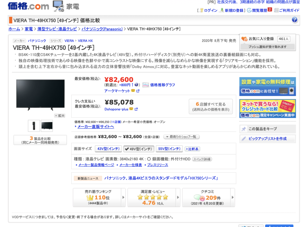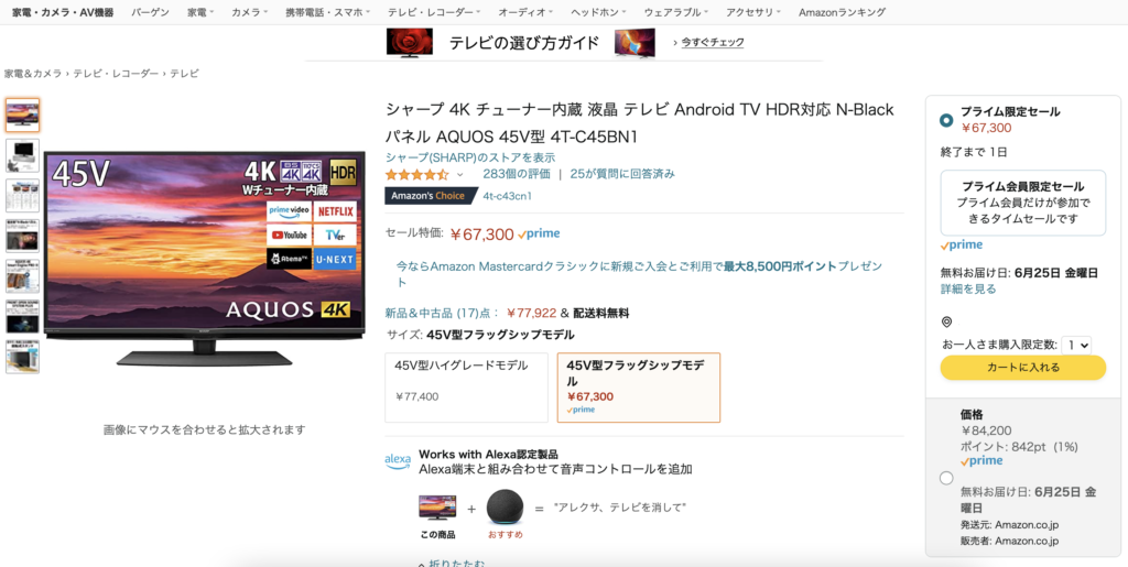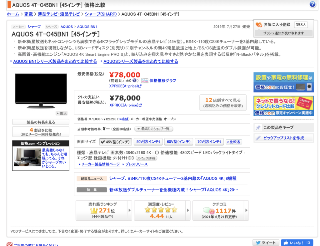 同一商品が価格コムで最安値78,000円が、67,300円!