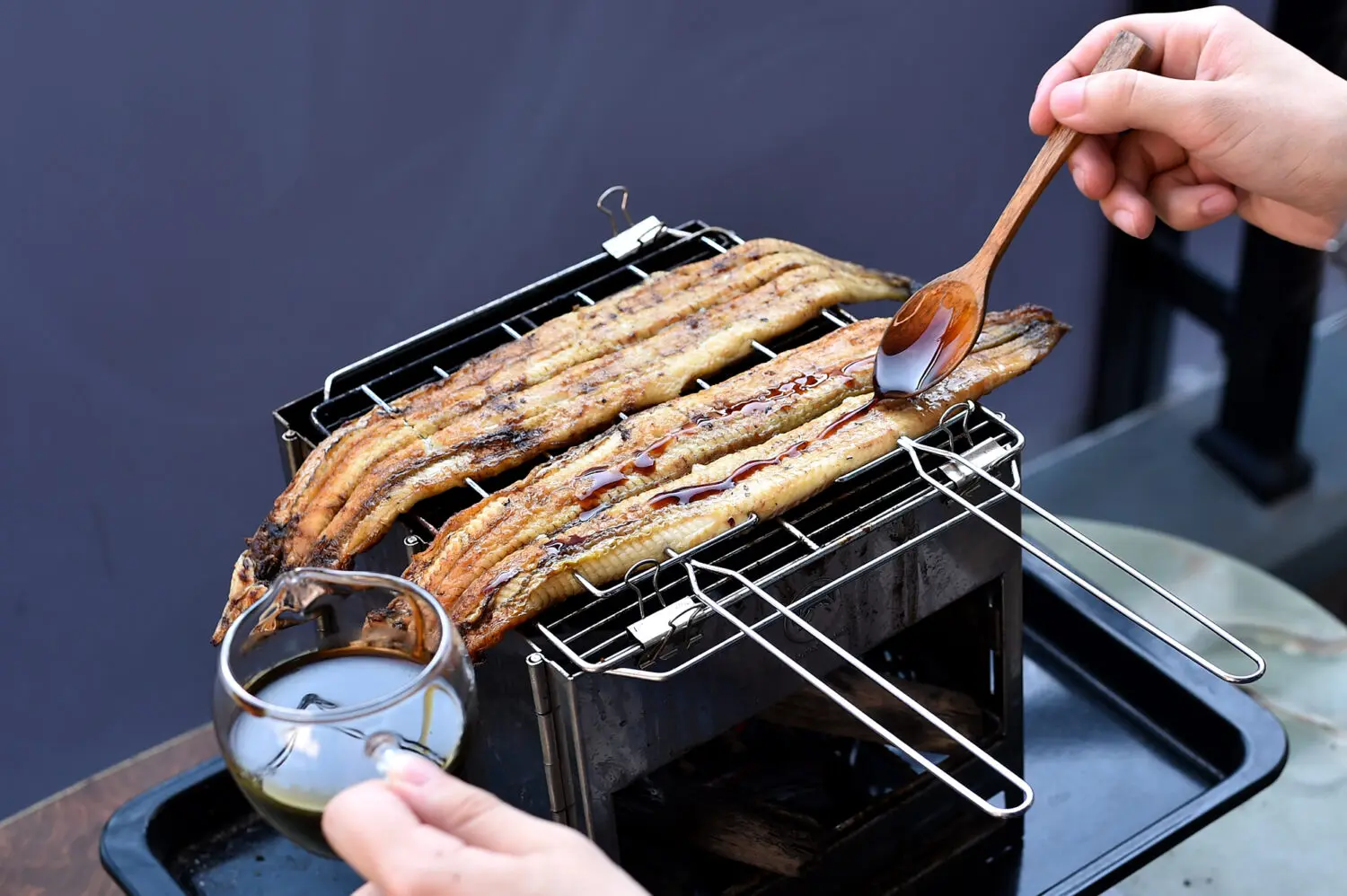 今回料理したのが、ウナギのタレ。白焼きを買ってきて、自家製のタレと自家製の乾燥実山椒と佃煮、究極の逸品が完成しました。簡易的なBBQセットで炭火焼をしただけなのに、普通のうなぎ専門店と同等以上の味わいになったので驚きます。炭火に落ちる油や醤油の焦げる香りが優しくつき、夏を感じることができました。