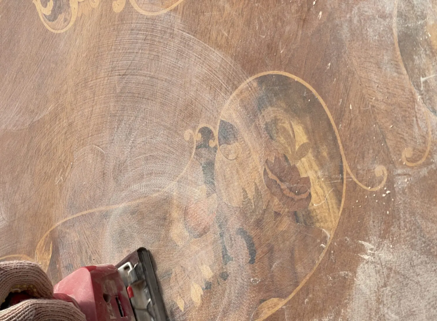 写真のテーブルはウレタン塗装で劣化していたので、サンダーで研磨して再塗装しました。