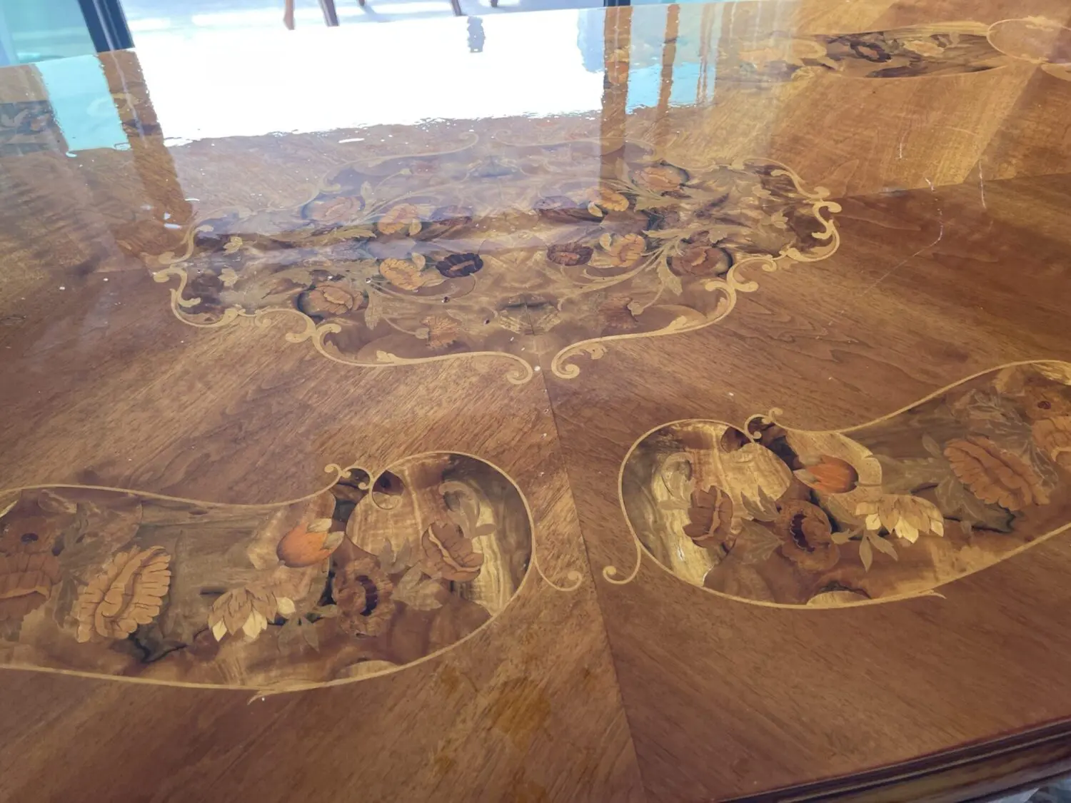 本物の木目を低価格で楽しめるのが特徴です。写真のテーブルのように象嵌細工を施したものもあります。