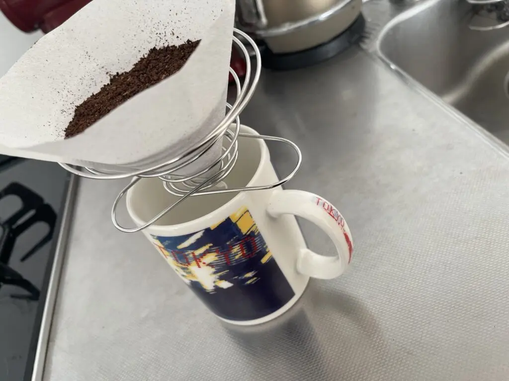 キッチンペーパーを円錐になるように折り紙の要領でたたみ、そこに挽いたコーヒー豆をいれれば緊急の一杯が飲めます。