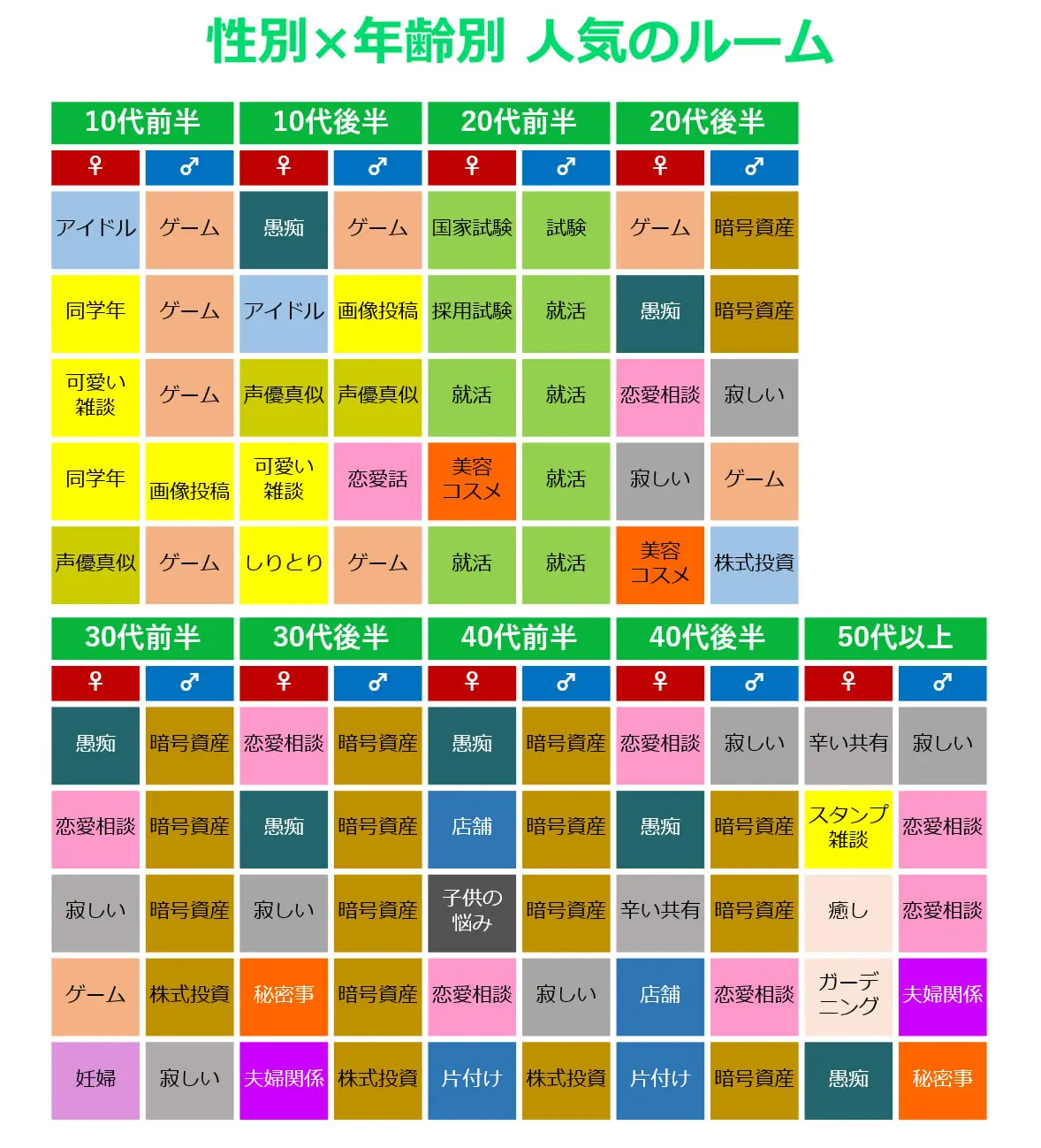 ブログの中に面白い統計情報があり、性別と年齢別の人気のルームを公開していました。母数が1500万人(推定)と日本の人口の1/10近い利用者で世代別の悩みが明確に反映されています。必ずしも相関関係があるとは限りませんが、遊び感覚で読んでみると面白いです。