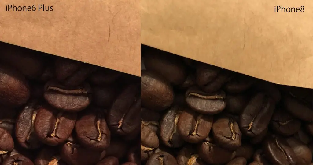 インスタグラムの普及によって、自撮りが一般的になり肌を滑らかに見せたいためか標準でPhotoshopでいう画像の平面処理がされるようになりました。下の写真を見ると分かりますが、新しいiPhoneにも関わらずコーヒー豆の紙袋の繊維がくっきり写っていないことがわかります。このように時代によっても画質だけでなく処理方法に変化があるのです。