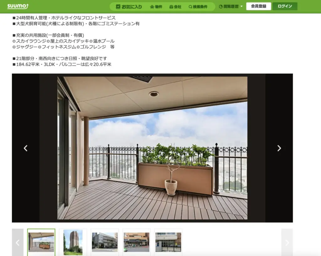 さすがに「空中バルコニー」といえば「元麻布ヒルズ」とすぐに分かってしまいますね。5億9800万円で購入できるそうです!築年数が20年近いにもかかわらず、驚くべき価格設定です。かつて日産のカルロス・ゴーン元社長も元麻布ヒルズに住んでいたそうです。ちなみに、さらに広いバルコニーを持つ部屋も存在するそうです。興味のある方はオールアバウトの記事に詳細が載っています。