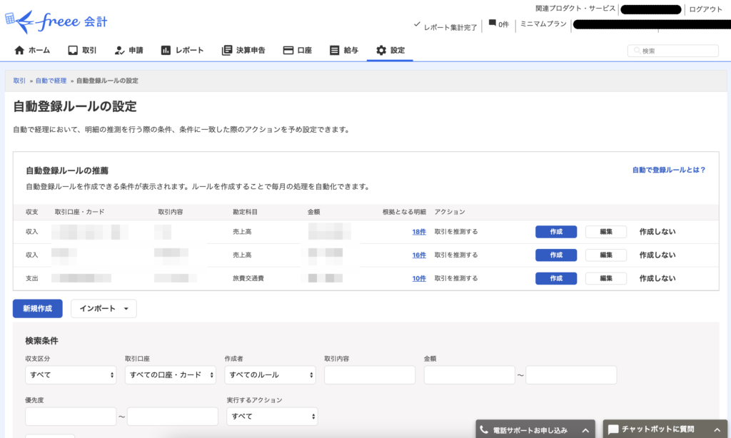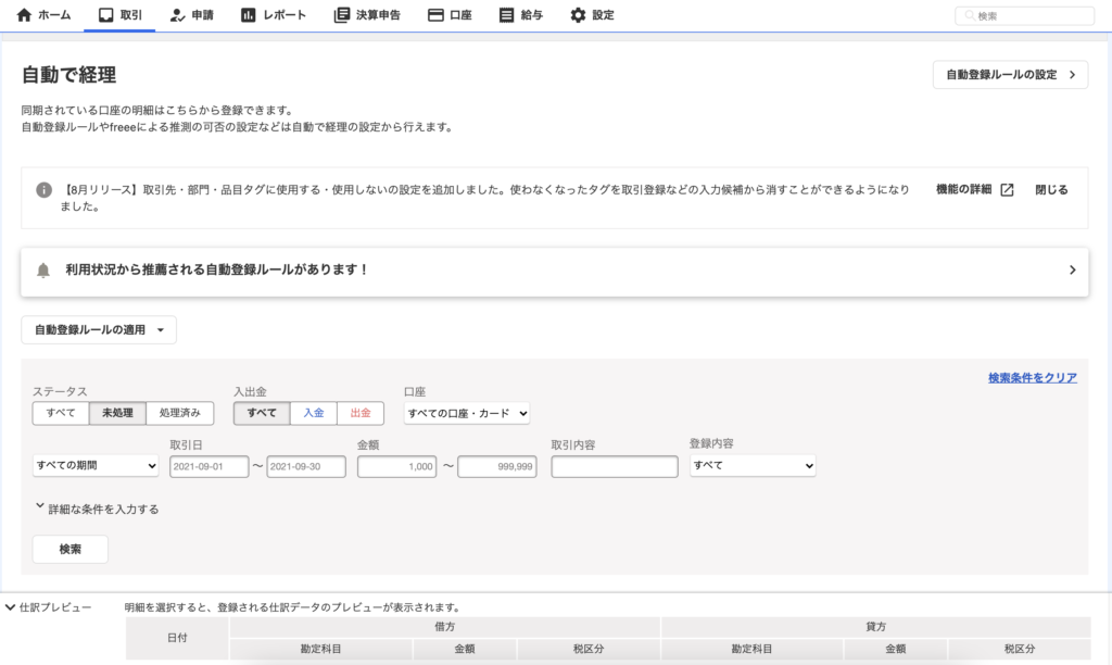 freee会計には「自動で経理」という機能があり、そこから「利用状況から推測される自動登録ルールがあります!」と、AIがコレとコレは毎回同じじゃない?代わりに入力しようか?と提案してくれるのです。