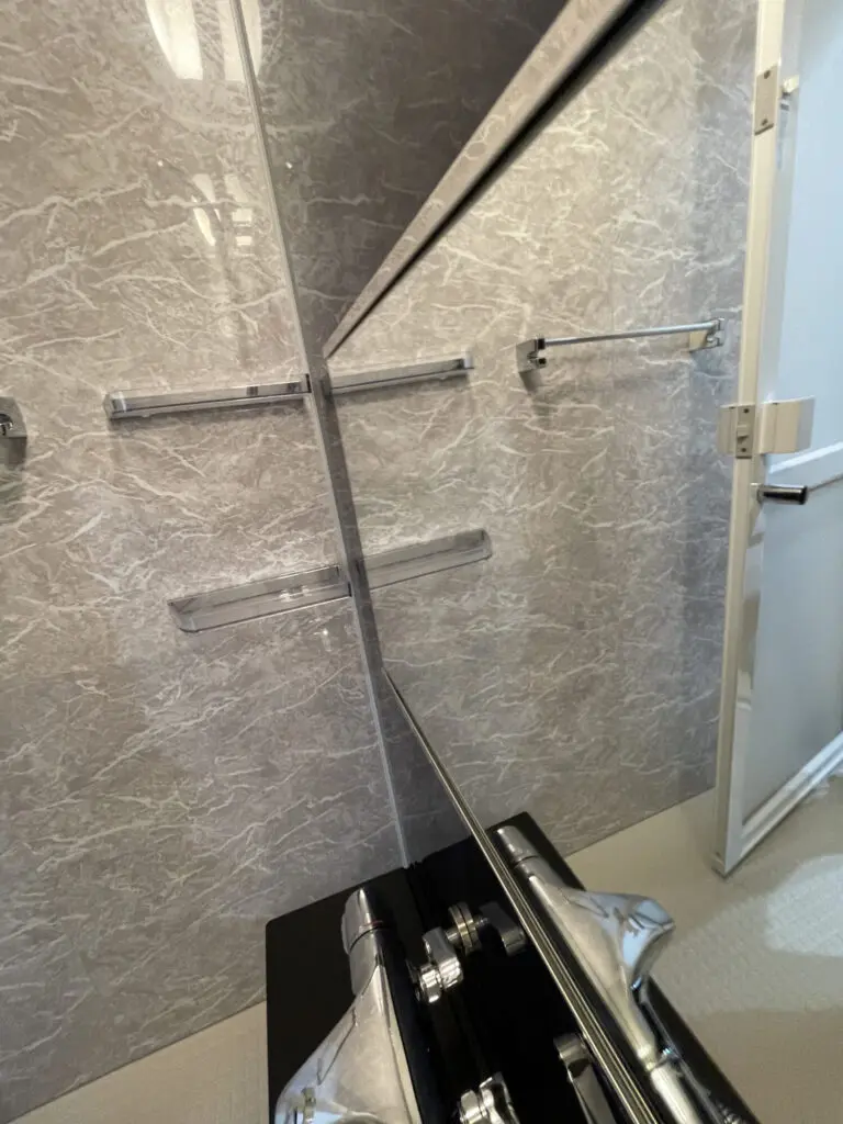 カビが発生しなくても、水道水に含まれるカルキや不純物によって鏡や壁、ドア、浴槽に水垢が発生してしまいます。特に鏡は数週間放置するだけで水垢がついて、それがどんどん酷くなっていきます。