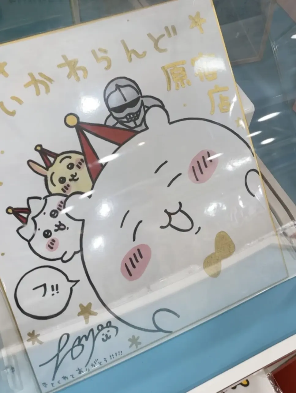ながのさんの書き下ろし色紙も飾ってあります!ちいかわカフェと比べると、シール機や等身大のキャラクター展示やイベントがなく少し物足りないかもしれませんが、ネット通販で入手しにくいグッズも揃ってるので、ちいかわ好きは満足できる品揃えです。