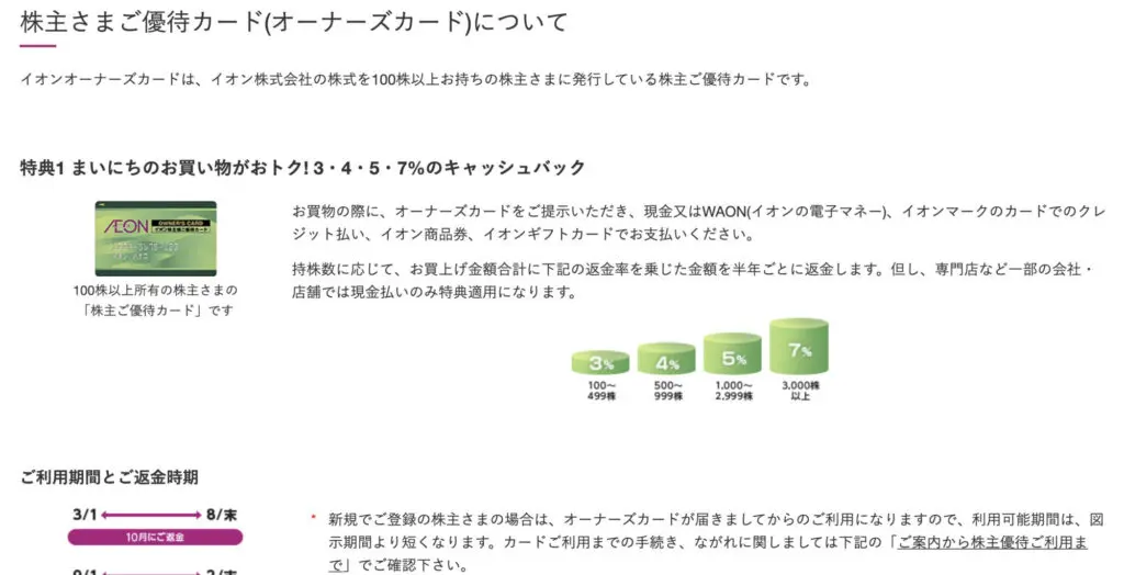 100株以上所有の株主にはオーナーズカードが発行されて、イオンモールで提示することで年に2回利用金額と保有株式数に応じてキャッシュバックを受けることができます。