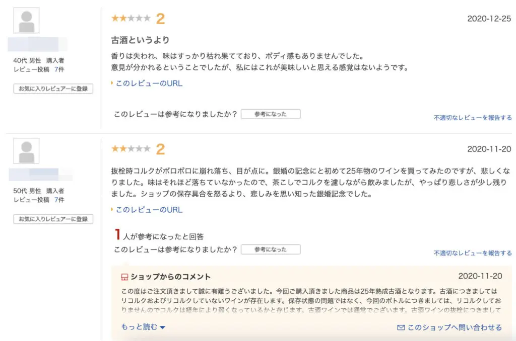 「抜栓時コルクがボロボロに崩れ落ち、目が点に。銀婚の記念にと初めて25年物のワインを買ってみたのですが、悲しくなりました。味はそれほど落ちていなかったので、茶こしでコルクを濾しながら飲みましたが、やっぱり悲しさが少し残りました。ショップの保存具合を怒るより、悲しみを思い知った銀婚記念でした。」