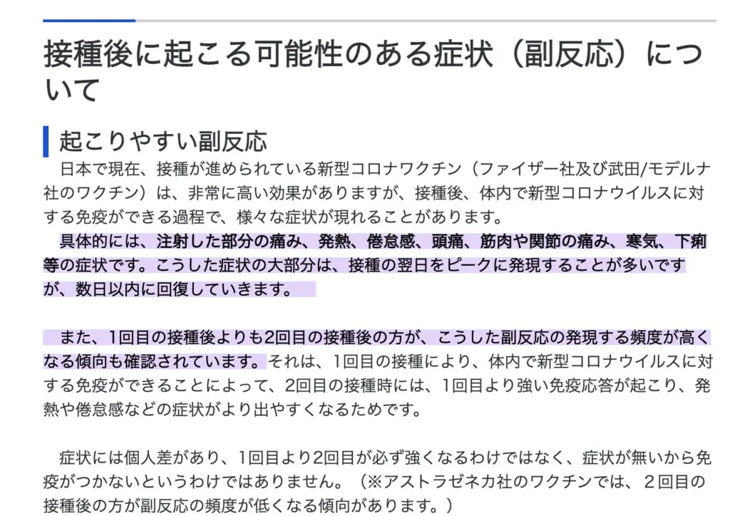 厚生労働省のサイトには、以下のように副反応が掲載されています。