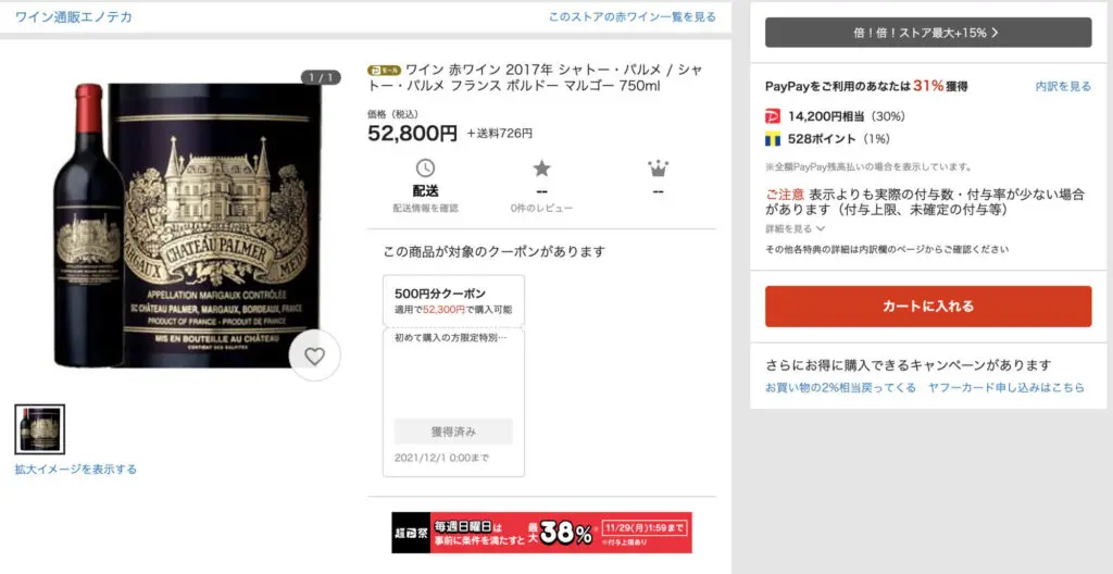 神の雫にも出て有名になったシャトー・パルメも、52,800円が14,728円相当のペイペイボーナス付与で38,072円相当になります!