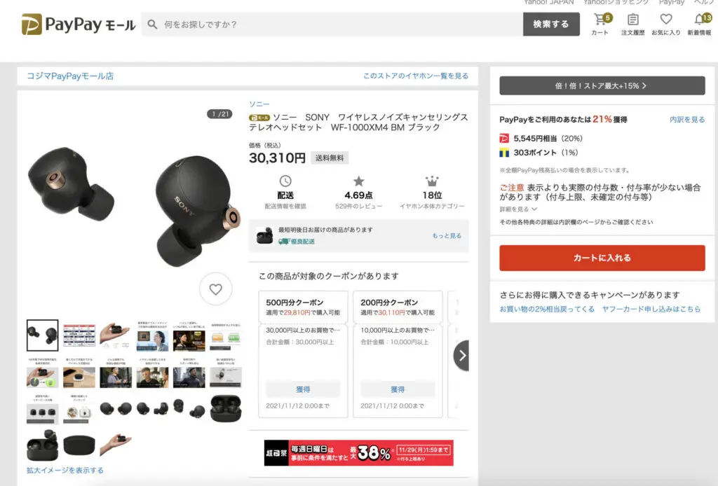 先日記事にした今人気のソニーのノイズキャンセリングイヤホンWF-1000XM4も、一見高いように見えて還元率が優れているので価格コムよりも最安値で入手できます。