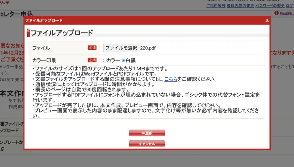 これ1度も受け取ったことないので、2021年12月になって初めて知ったのですが、PDFをぽん!とアップロードするだけで簡単にA4プリントなどの郵便物を送付できます。