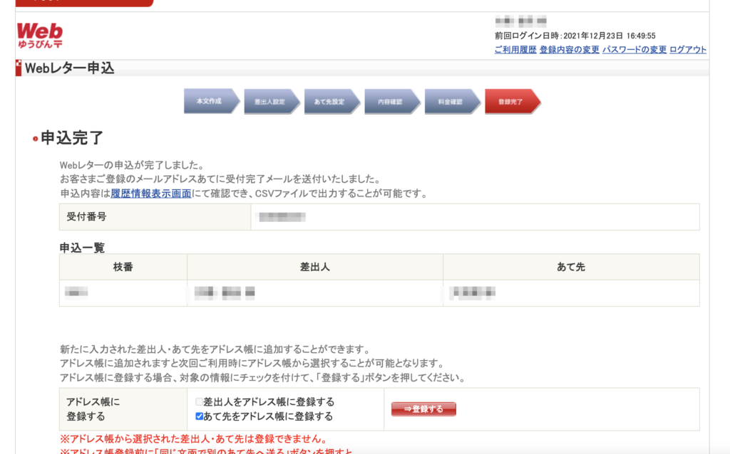 ここで今回送付した人をアドレス帳に登録できます。ですので、何度か送る可能性があれば登録するをクリックすると便利です。