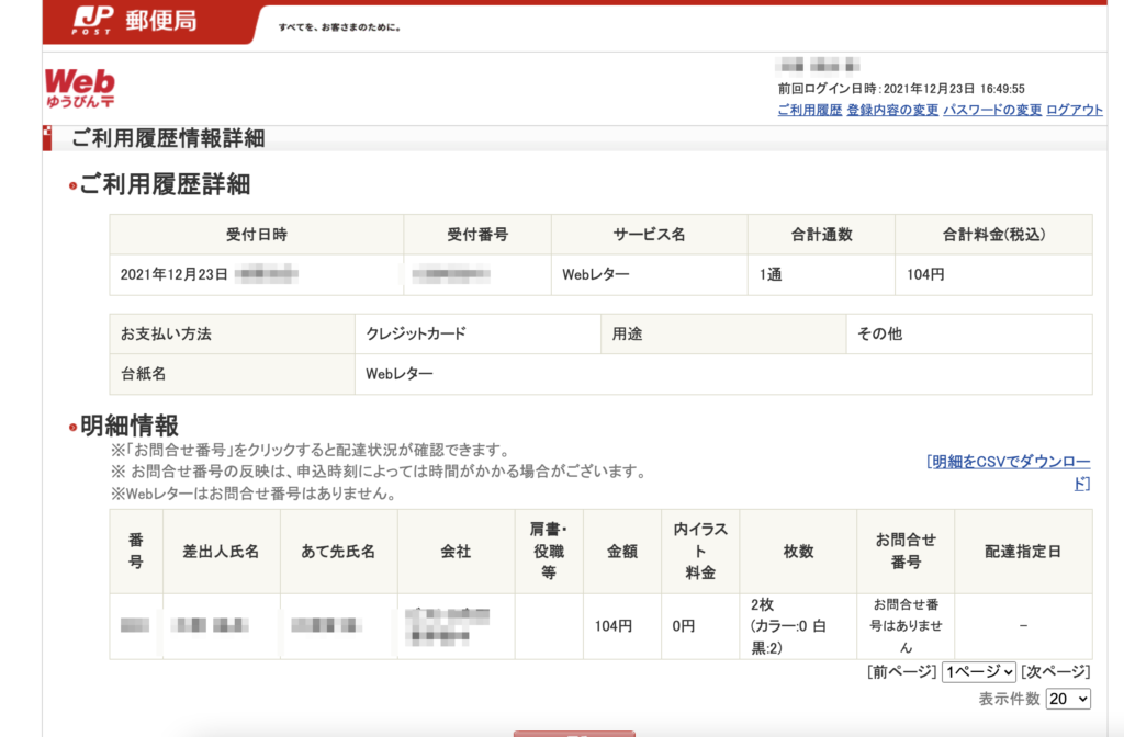明細はCSVでダウンロードできるので定期的にダウンロードすると送付リストをエクセルなどに活用できます。