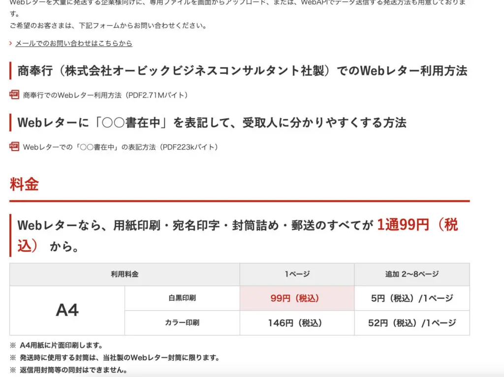 令和3年12月23日時点での価格では、利用料金はA4で白黒1ページ99円(税込)で追加2~8ページで、5円(税込)/1ページごとです。カラーは1ページ146円(税込)で追加2~8ページで、52円(税込)/1ページごとです