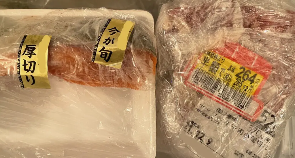 解凍ではない生の鮭などが値引きで安くなっているときは、ぜひ手に入れましょう。少々面倒ですが、一度フィルムを剥がして中身をラップして、再び洗浄したトレイに戻して冷凍庫に入れます。