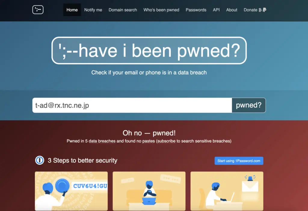 普段使っているメールアドレスに、いつの間にか迷惑メールが大量に届くようになった経験はありませんでしょうか。 このサイトでは、あなたのメールアドレスやパスワードが流出していないか、また流出していたらどういった経路で流出したかを確認できます。