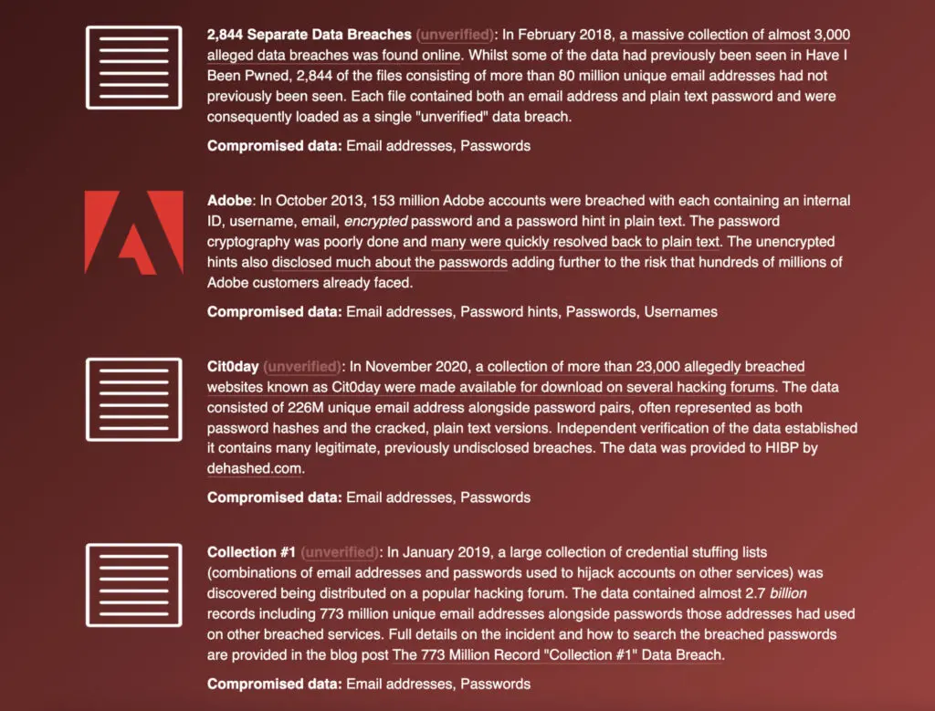 2,844 Separate Data Breaches (unverified): In February 2018, a massive collection of almost 3,000 alleged data breaches was found online. Whilst some of the data had previously been seen in Have I Been Pwned, 2,844 of the files consisting of more than 80 million unique email addresses had not previously been seen. Each file contained both an email address and plain text password and were consequently loaded as a single “unverified” data breach.