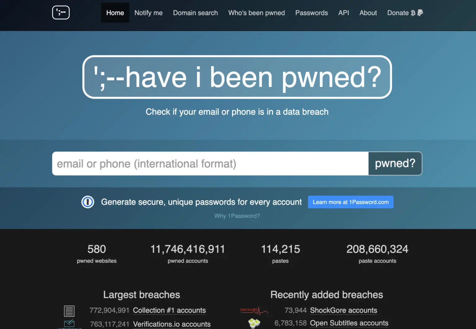 Collection #1 (unverified): In January 2019, a large collection of credential stuffing lists (combinations of email addresses and passwords used to hijack accounts on other services) was discovered being distributed on a popular hacking forum. The data contained almost 2.7 billion records including 773 million unique email addresses alongside passwords those addresses had used on other breached services. Full details on the incident and how to search the breached passwords are provided in the blog post The 773 Million Record “Collection #1” Data Breach.