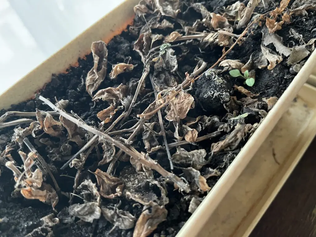 2週間ほど世話をしていると、死んでしまったと思ったミントも、なんと小さな芽が土の下から生えてきました。 マッチ棒の先ほどの小さな芽で、力強く復活しようとしている姿を見て感動してしまいました。