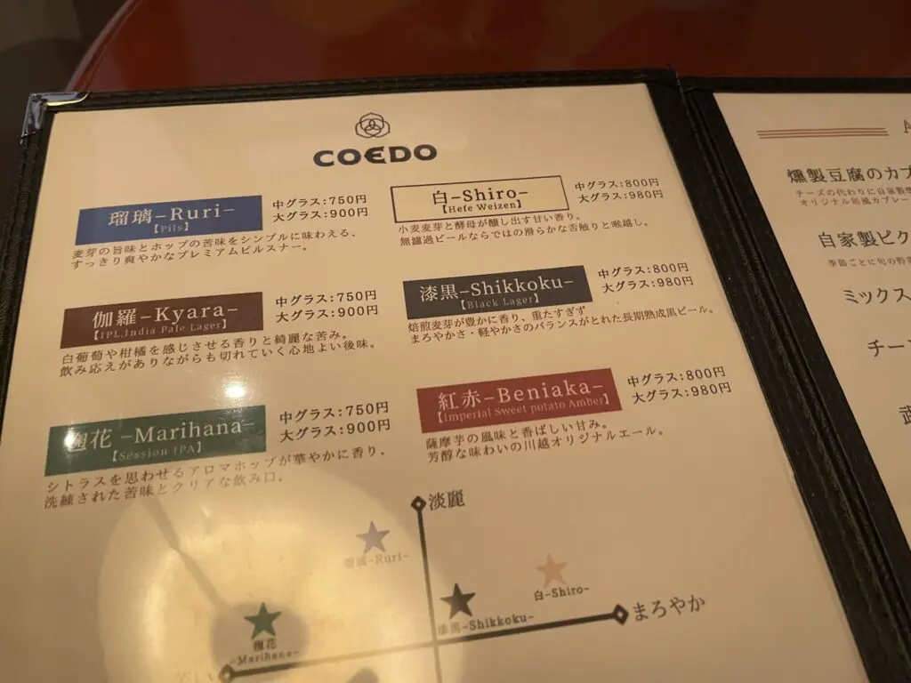 この店では、6種類のコエドビールを生で楽しむことができます。 やはりクラフトビールや地ビールを「缶」で飲んでしまうというのはかなり悪策で、往々にして満足いかない結果となります。 川越のこの小江戸周辺では、コエドビールの生を出す店がいくつもありますが、中でもコンディションが良さそうなお店を選んでみました。