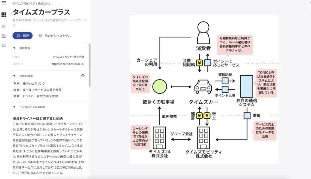 おかにも、カーシェアリングの最大手「タイムズカープラス」は 利用していない人にとっては、どのようなサービスかいまいち想像しにくいのですが、この図解を見ると会社がどのような方法で売り上げを上げているか分かります。