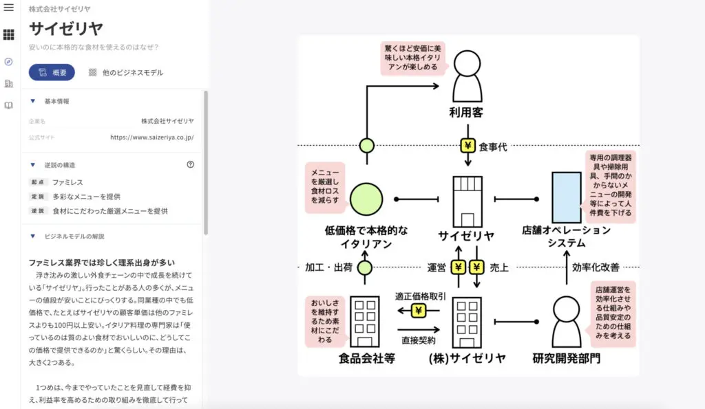 例えば今話題になっているサイゼリヤのビジネスモデル。何冊も本が出ていますがインターネットで簡単に、どのようなビジネスモデルか確認したいときにこのサイトが便利です。 世界で1番有名なイタリア料理チェーン店とも言われるほど、どの店舗でも品質が安定して格安で料理を食べることができます。その仕組みについて、図解でわかりやすく説明されているので、すらすら理解することができます。