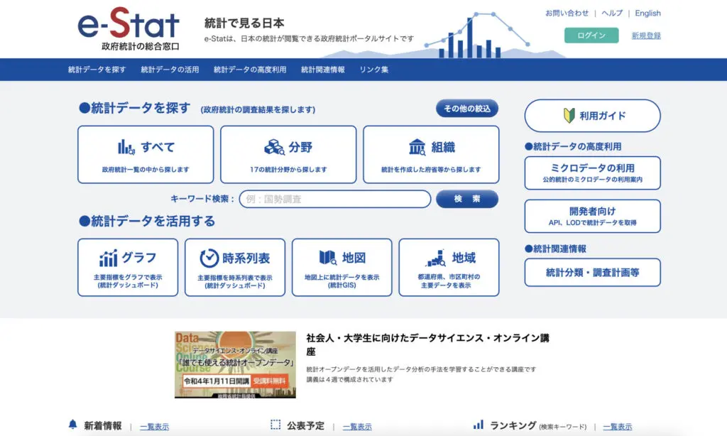 実店舗形で運営する場合は、 出店予定を検討しているエリアの人口動態や地域特性・商業規模など調べるのにe-Statという政府統計ポータルサイトが便利です。 統計データをグラフや時系列に並べたり、自分の住んでいる住所を入力してその周辺の情報について調べたりすることができます。いちど良いビジネスのアイディアが出たとしても、それを提供する相手がいなければ意味がありません。そのためこのような統計サイトと組み合わせて、実現可能かどうか検討すると良いですね。