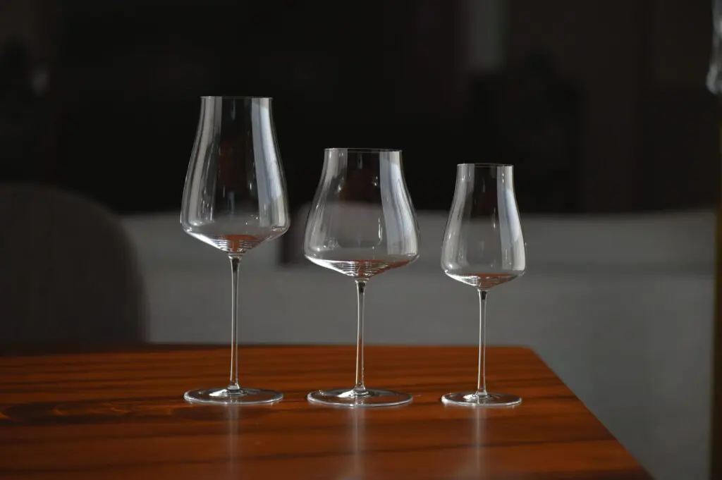 1客16,500円〜でハンドメイドの美しさと、香りや味わいのバランスを楽しむことができます。左からシラー、シャルドネ、シャンパンです。ステムは極限まで細く、プレートの厚みも薄く、それでいてボウルは下に向けて膨らみがありノーズ部分はきゅっとしまっています。