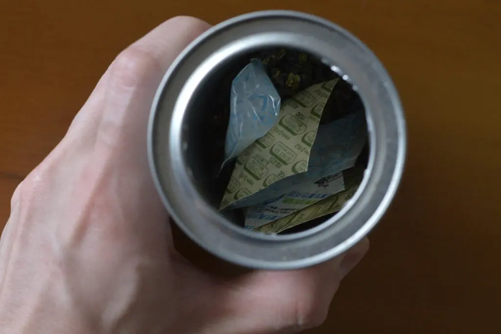 乾物という横つながりがあるお茶ですが、烏龍茶も同じように酸化や劣化が激しく管理が大変です。脱酸素剤であるエージレスと乾燥剤のシリカゲルを何個か缶に入れたところ、劣化の進行が遅くなり開封時の風味に近いまま維持ができています。