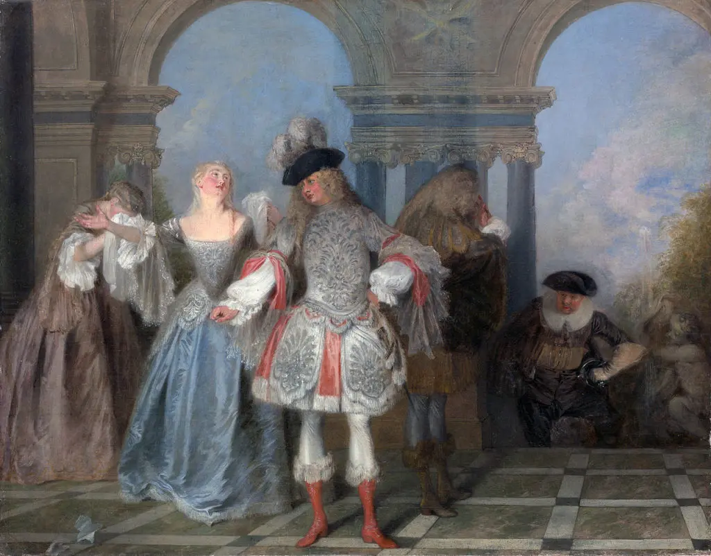 舞台が我々に見せる光景は虚構のものです。役者は自身の人格を隠し別人を演じ、彼らの背後に見える様々な風景も絵筆で描かれたものに過ぎません。それゆえ、演劇に似たヴァトーの絵画に描かれる喜びは、本質を欠いた虚構、表面的なまやかしであるかのように思われます。浮世離れした雅宴画の華やかさは、実質に根差したものではなく、偽りか、あるいは虚飾に過ぎないのです。もっとも、これらの絵画には、享楽の表面性は読み取れても、その裏に隠された感情が何であるのかは必ずしも自明ではありません。おそらくそれは倦怠なのでしょうが、詩人が雅宴画の裏に認めたのは、悲しみでした。
