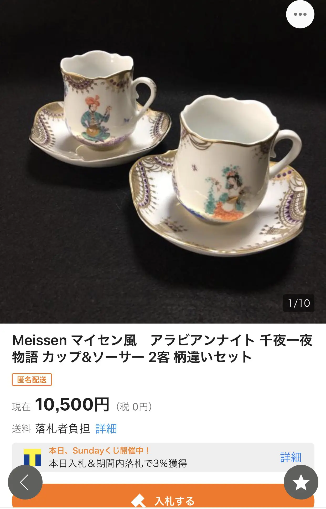 マイセン/アラビアンナイト コーヒーC/S(23582)はユーロクライシスという販売店では、定価¥450,000+税 35%OFF ¥292,500+税で販売しています。ペアで643,500円です。こんな代物を素性の分からず、「恐らくマイセンだと思います。マイセン風です。」と出品している事自体がおかしいのです。結局このオークションはペア7万円程度で落札されていました。