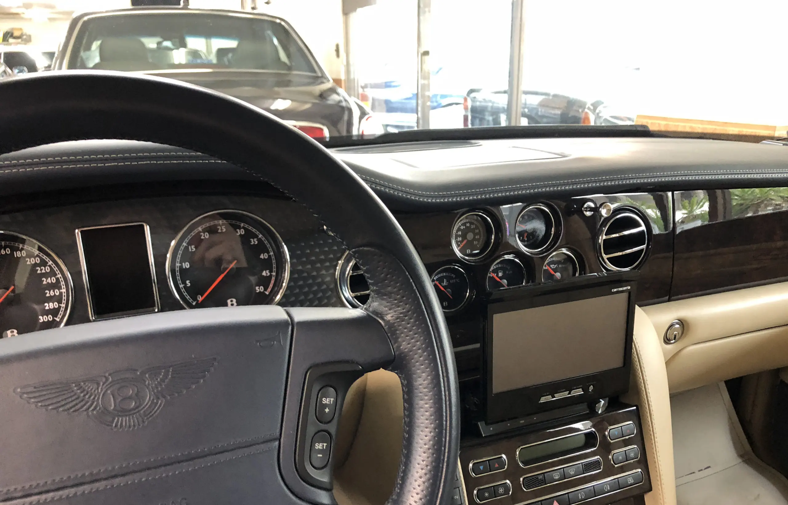 年式が新しいにも関わらずライトニングケーブルに非対応で、iPhone4までの平べったいケーブルしか刺さらない仕様です。新型コンチネンタルGTにはCarPlayといってスマホと連動する便利な機能がありますが、ちょっと前のベントレーはCDかSDカードで曲を再生するしかありません。