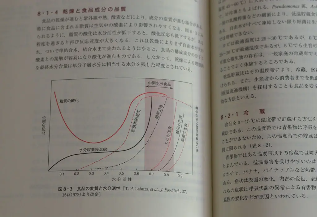 第八章からは食品の貯蔵という興味深い分野となり、読み物としても楽しめます。乾燥と食品成分の品質。水分活性とカビの生育、酵母の生育、細菌の生育のグラフなど相関関係。冷凍貯蔵の項目は、家庭で精肉や鮮魚の冷凍がなぜ上手にいかないか理論的に理解できるようになっています。冷凍焼けの原因、急速冷凍の必要性なども分かります。