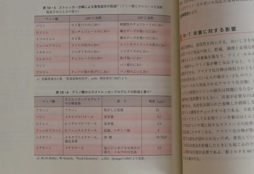 例えばアミノ酸のバリンは100度加熱でライ麦パンのニオイ、180度では刺激性のチョコレートのニオイ。フェニルアラニンはスミレの花のニオイから、180度ではスミレやライラックの花のニオイなど変化は様々で、体感的にしか知り得なかったことが加熱による脱酸素反応や加水分解によって変化するという事が紹介されていて中々面白いです。