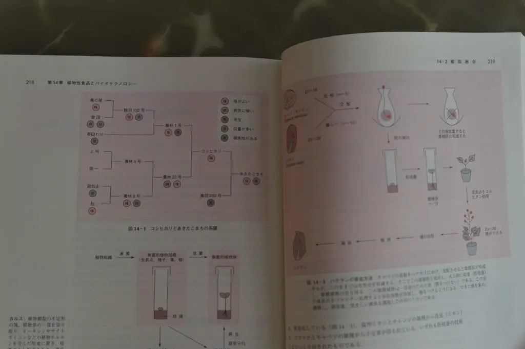 酵素、微生物利用とバイオテクノロジーでは酵素のスクリーングなどに触れて、遺伝子組み換え技術に、そこから植物性組織培養に移ります。遺伝学の植物の交配や、交配によった新しい野菜品種の作り方について紹介しています。