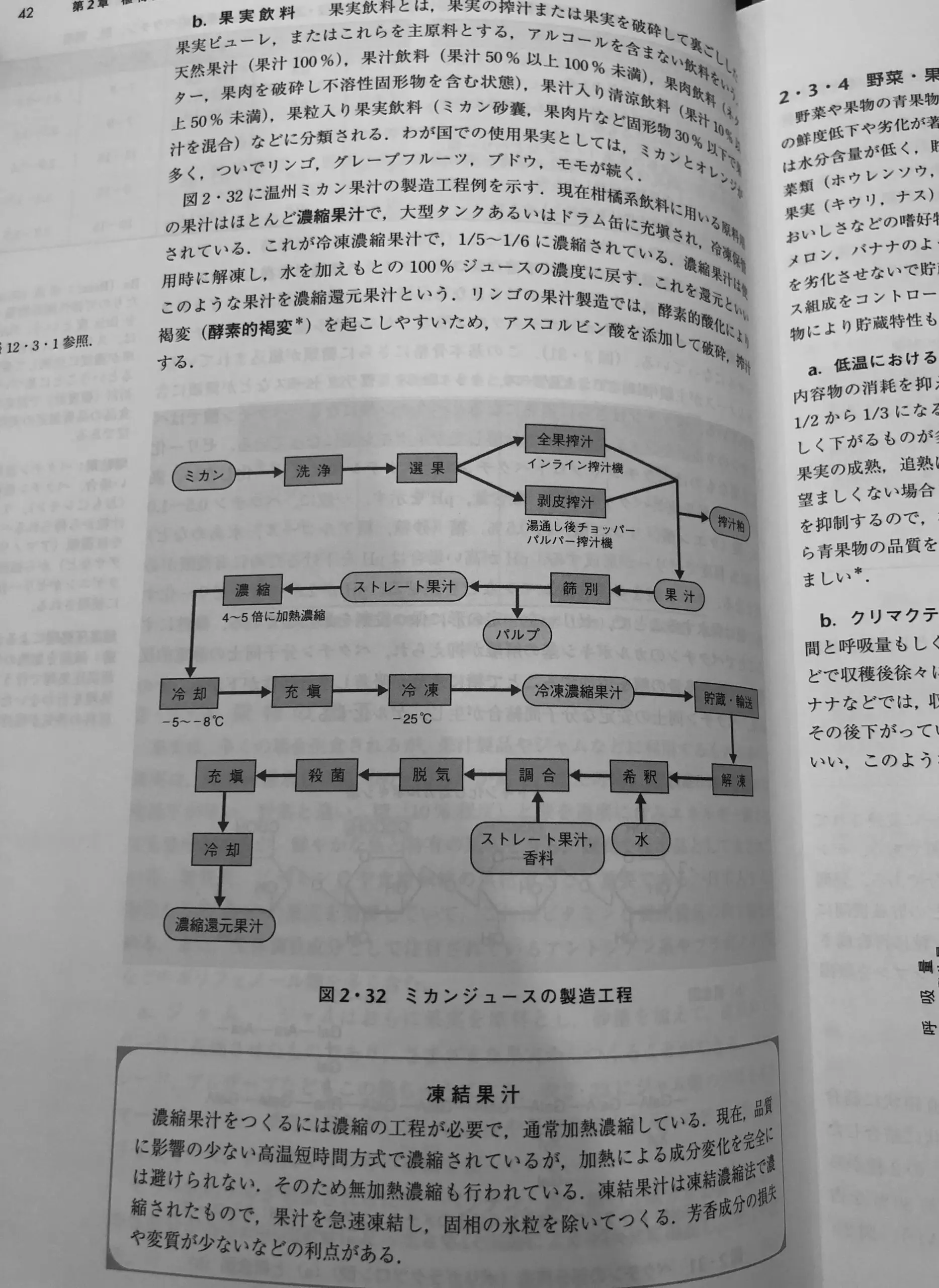 この章では小麦の加工や、大豆、果実の加工について触れていますがb.果実飲料には、ジュースについての記述があります。知っていそうで知らなかったのが果汁の分類で、天然果汁(果汁100%)、果汁飲料(果汁50%以上100%未満)、果汁飲料(ネクター、果汁を破砕し不溶性固形物を含む状態)、果汁入り清涼飲料水(果汁10%以上50%、未満)、果粒入り果汁飲料(ミカン、果肉片など固形物30%行かで果汁を混合)など、一口に「ジュース」と表現される果汁飲料にも法令によって様々な分類がされていることが分かります。濃縮果汁や褐変(酵素的褐変)によるアスコルビン酸(ビタミンC)の添加、またb.クリマクテリックライズには収穫後の貯蔵期間と呼吸もしくはエチレン生成量の関係図にも触れています。