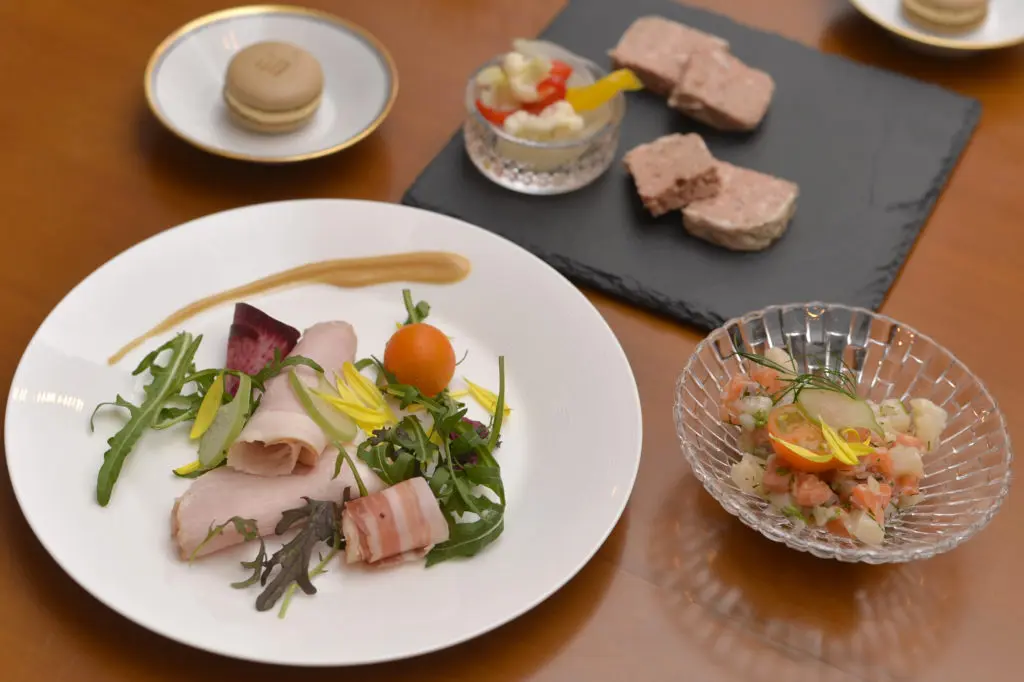 海鮮の前菜はガラスなど透明の器が便利です。パテドカンパーニュなどは一口サイズに切って、先日買った花崗岩に乗せてみました。マカロンはリチャードジノリのエスプレッソ用ソーサーに。