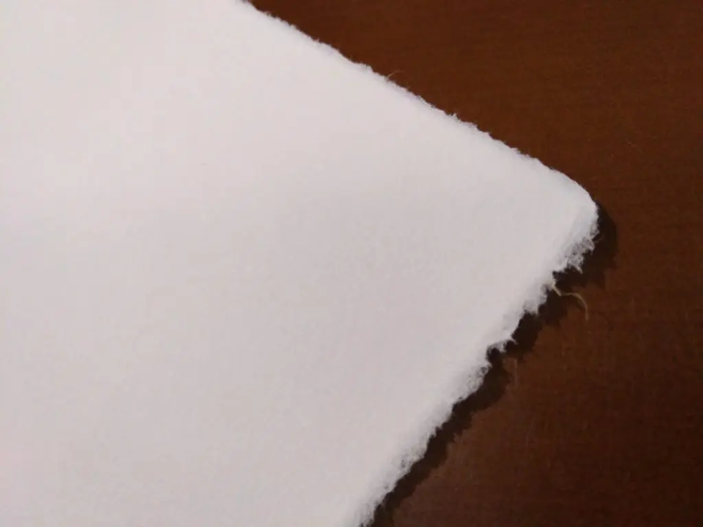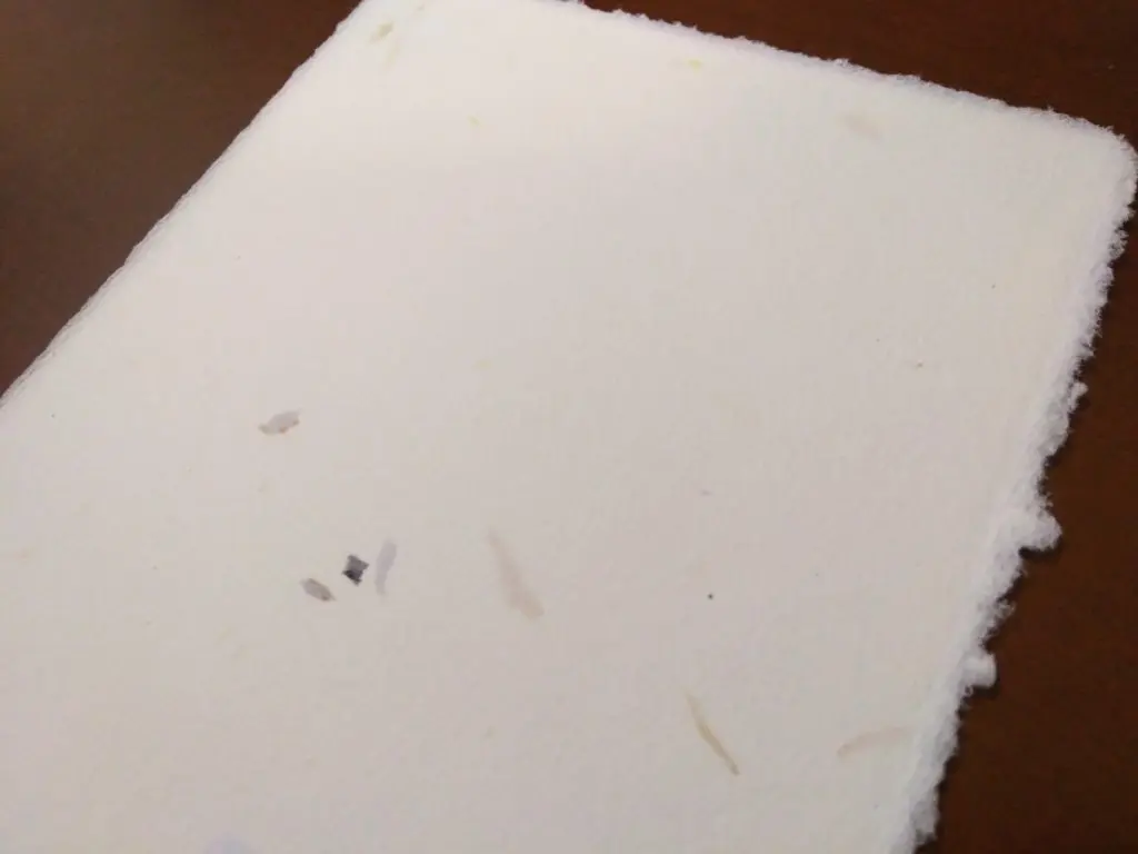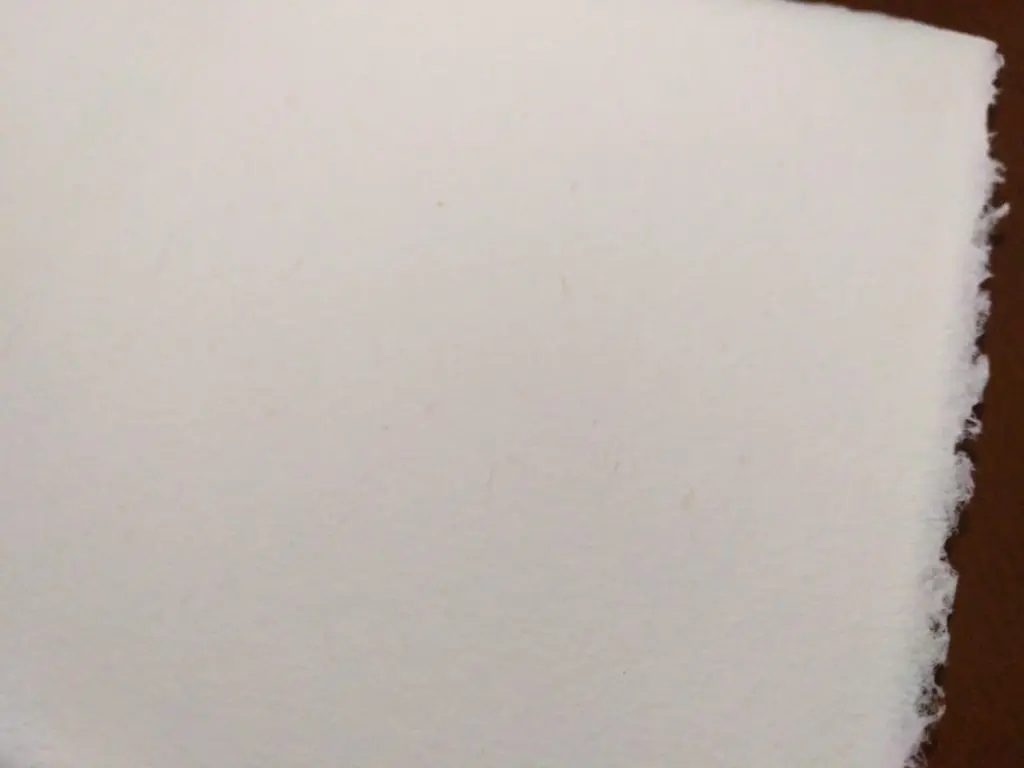 紙の端は切り揃えられておらず、漉かれた状態のまま残されています。和紙であれば「耳」と呼ばれる箇所であり、これが残っていることが手漉きの証です。