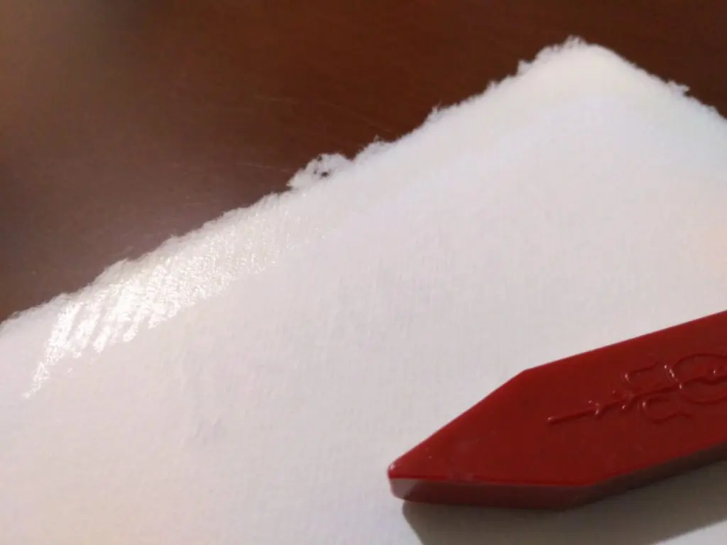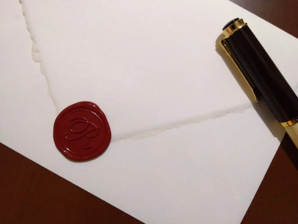 封筒にはあらかじめ糊が塗られています。ただしこの糊の接着力は若干弱く、封を閉じるにはいささか心許ありません。これはある意味で欠点なのかもしれませんが、本来封筒がシーリングワックスにより封緘されるものであることを考えれば、納得がいくことでしょう。糊はあくまで補助的なものであり、封筒の蓋が空かないようにするのは封蝋の役目なのです。なおシーリングワックスに関しては、ハードタイプのものを選ぶと良いでしょう。破損の恐れはありますが、それでもやはり手漉き紙には、上質で伝統的なワックスが似合います。