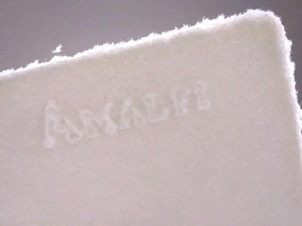 また表面を見ると、布地のような細かい凹凸があります。これは漉き桁の底に張られたワイヤーの跡です。アマトルーダの紙は、織物のように編まれた簀で漉かれた、いわゆるウーヴ紙wove paperです。中世後期以来ヨーロッパで伝統的に生産されてきたのは、平行に張られたワイヤーの跡が縞目状に残るレイド紙laid paperでしたが、ウーヴ紙にも十分伝統的な価値があります。ウーヴ紙が発明されたのは18世紀半ばのことです。あのモーツァルトもアマルフィの手漉き紙の愛用者でしたが、おそらく彼が用いた紙もこのようなウーヴ紙だったのでしょう。