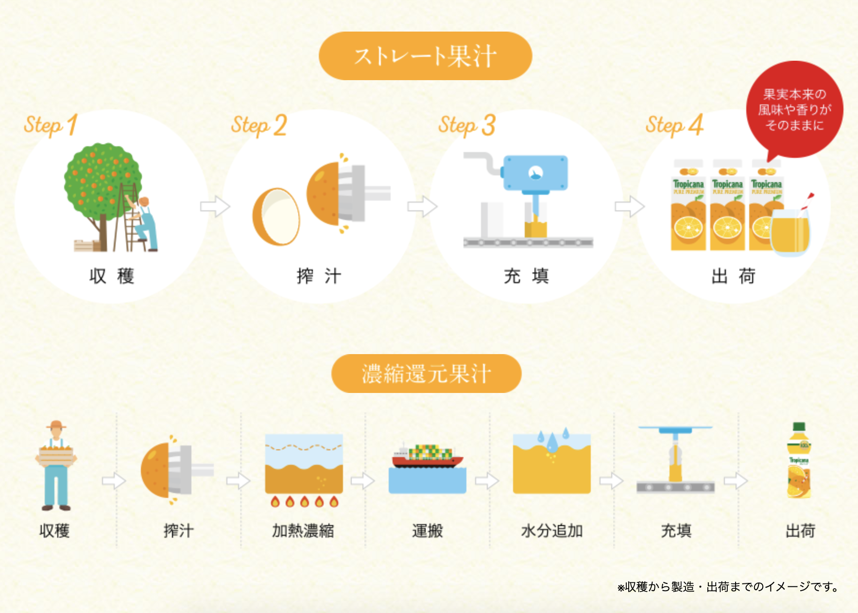 公式サイトのイメージ図を引用してみますが、ストレート果汁は収穫して搾汁したものをそのまま充填して出荷するようです。それと比べると濃縮還元果汁は加熱濃縮して日本に運搬、その後に水分を追加してから充填、出荷するようです。
