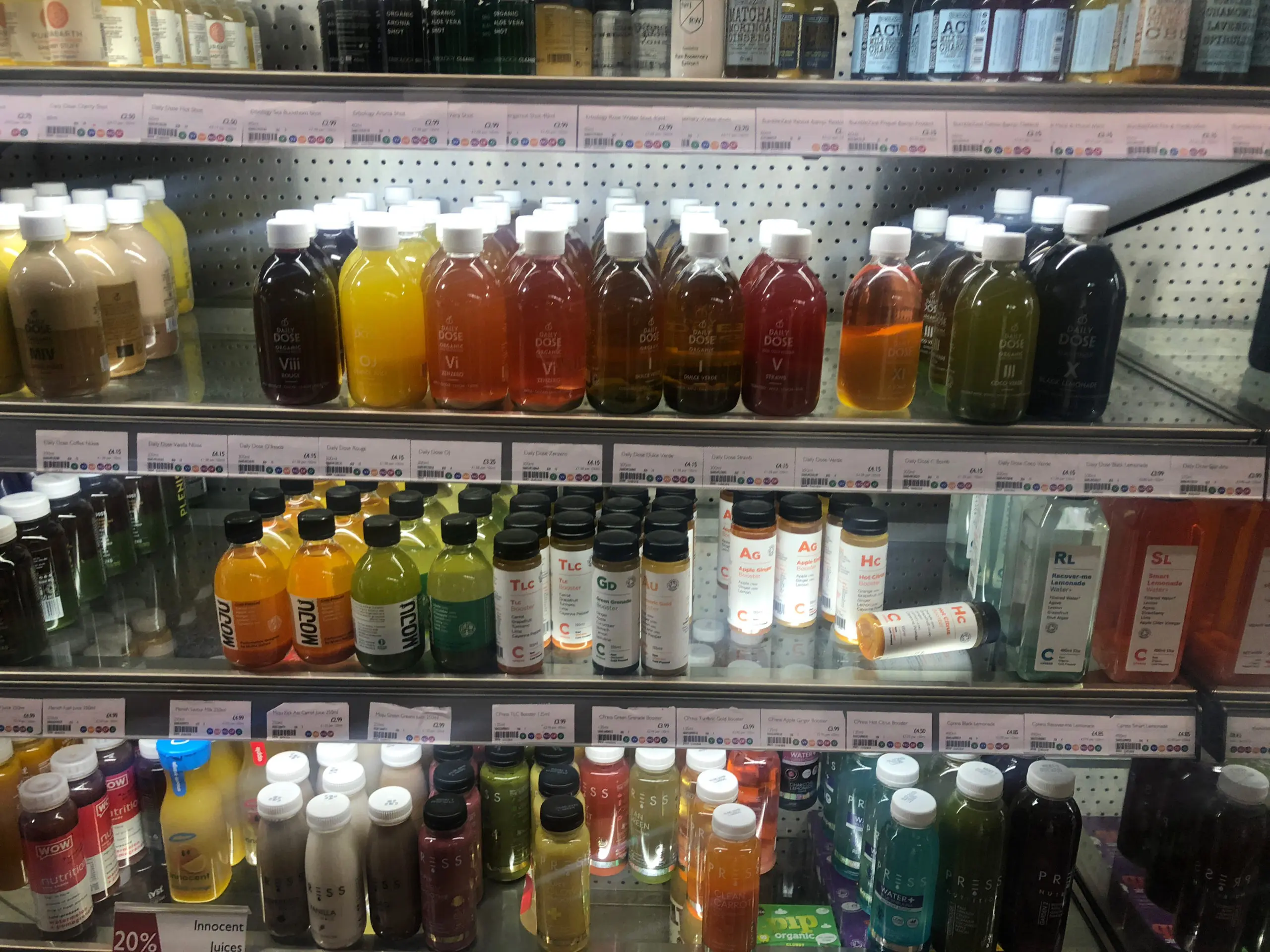現地ではコンビニ(M&S Simply Food)や小さいスーパーで入手できます。クランベリー、ラズベリー、ミックス系のジュースなど様々です。上の写真はロンドンのPlanet Organicというスーパーマーケットですが、ビタミンが添加された栄養ドリンクから、バラの香りがする砂糖不使用のローズウォーターまで多彩な飲み物が揃っているのが印象的でした。