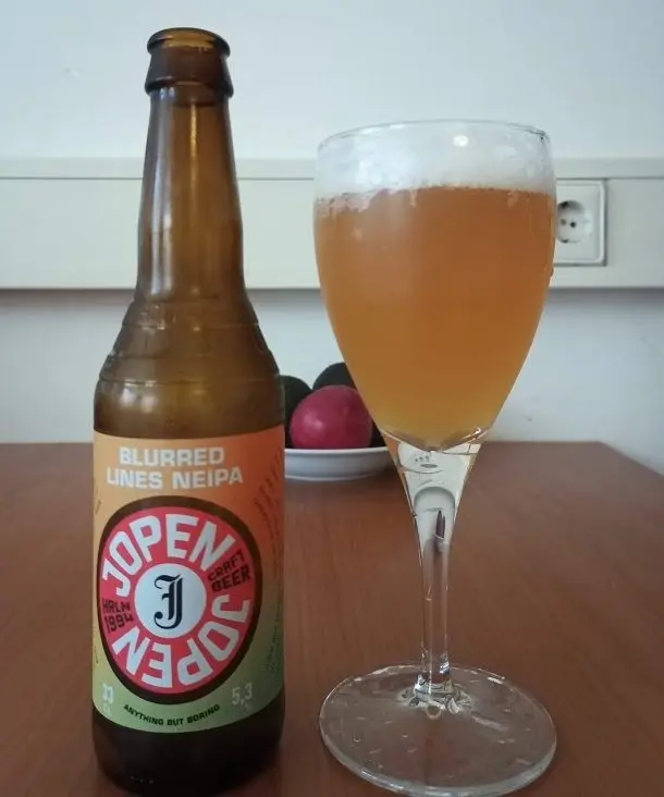 一本目はBlurred Lines Neipa。Blurred LinesというのはRobin ThickeとPharrell Williamsの同名のヒット曲からとっているそう。NeipaはNew England IPAの謂。このIPAについてはBrewNoteという日本語のサイトに詳細な説明を見付けましたのでリンクを貼っておきます(https://brewnote.tokyo/2017/07/newenglandipa/)。まとめると、アメリカのニューイングランド地方発祥のIPAの種類で、口当たりがよいこと、色が濁っていること、ホップの主張がそれほど強くないこと、トロピカル、柑橘系のフルーツの味が特徴として挙げられます。