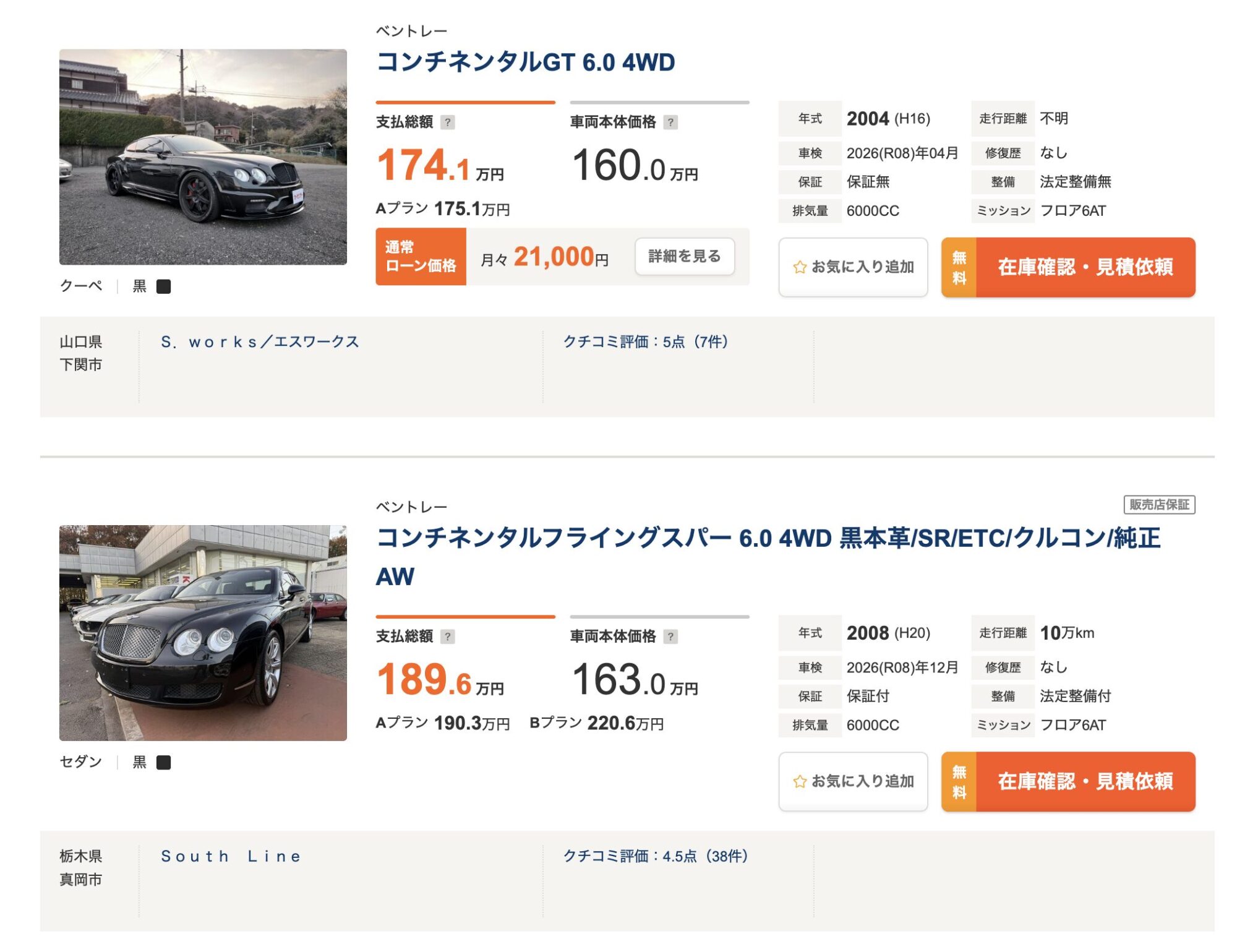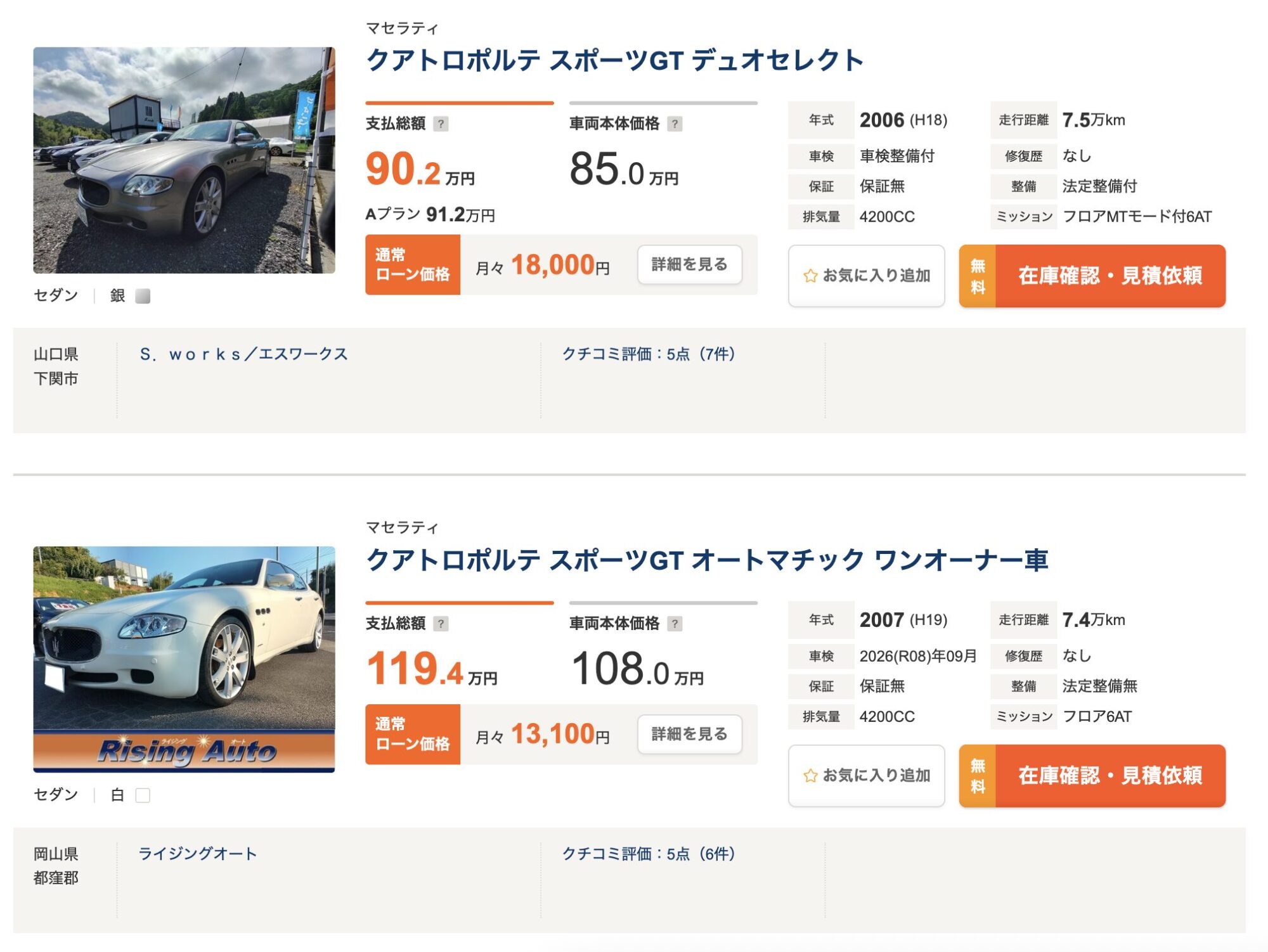2004年式のベントレー・コンチネンタルGTが160万円、2005年式のマセラティ・クアトロポルテが85万円――そんな具合に、新車当時は1500万から2500万円ほどもした憧れの輸入車が、まるで国産中古車のような手頃な価格で売られていることがあります。